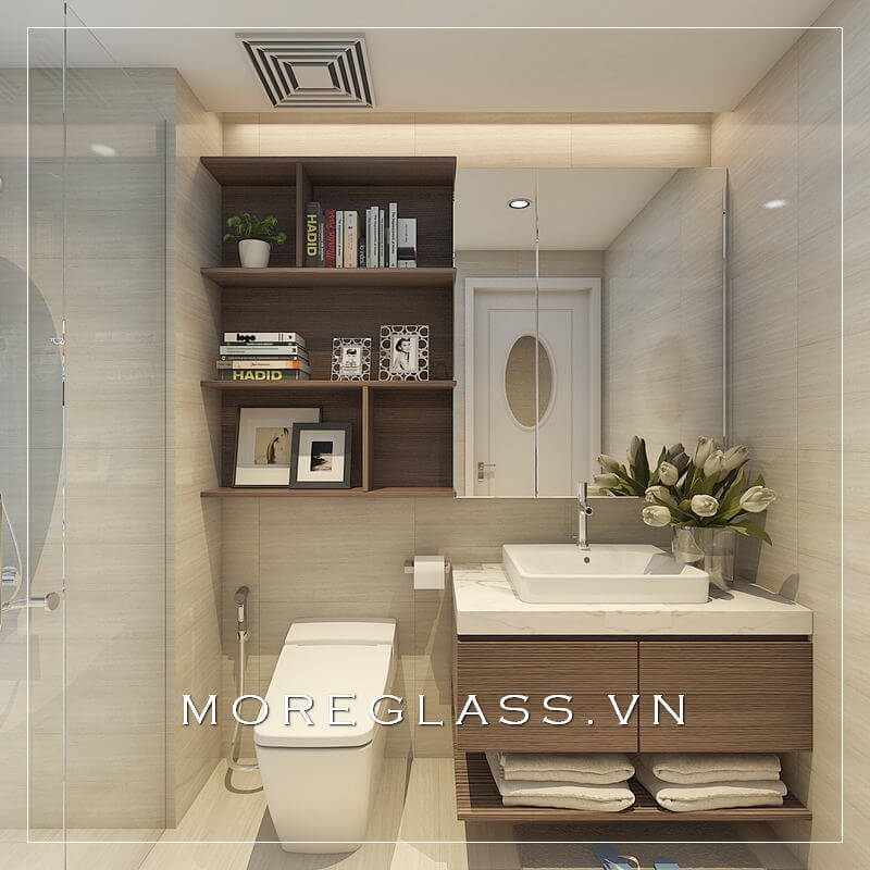 Tủ kệ gỗ có thiết kế đơn giản, nhỏ gọn để phù hợp với phòng tắm chung cư hiện đại.