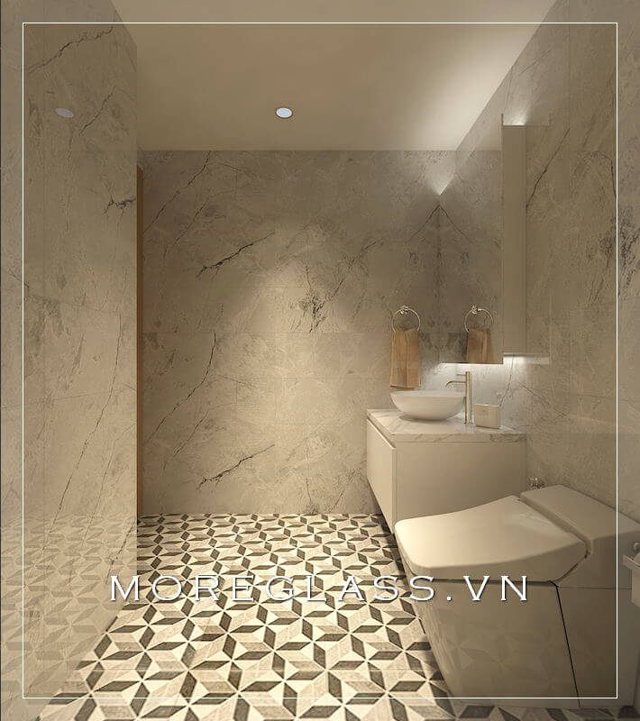 Phòng tắm được trang trí đẹp bằng nội thất và thiết bị vệ sinh đơn giản, tiện nghi, với tông màu gạch ốp sáng tạo nên sự thoáng đãng cho căn phòng.