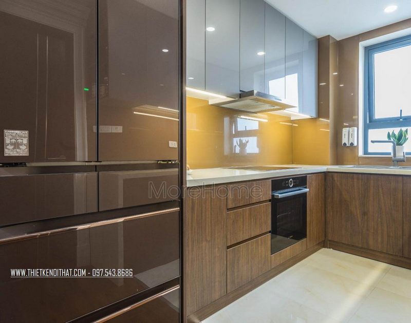 Khu vực bếp tân cổ điển được lắp đặt với cửa ra vào quay lưng để đảm bảo luồng khí phong thủy đi theo hướng đúng, mang lại nhiều may mắn và tài lộc cho chủ nhà.