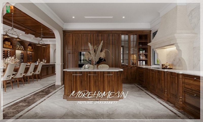 Hệ tủ bếp biệt thự được làm từ gỗ óc chó tự nhiên, kết hợp với cánh tủ kính và mặt tủ đá nhân tạo màu trắng, tạo nên một tổng thể không gian bếp tân cổ điển sang trọng.
